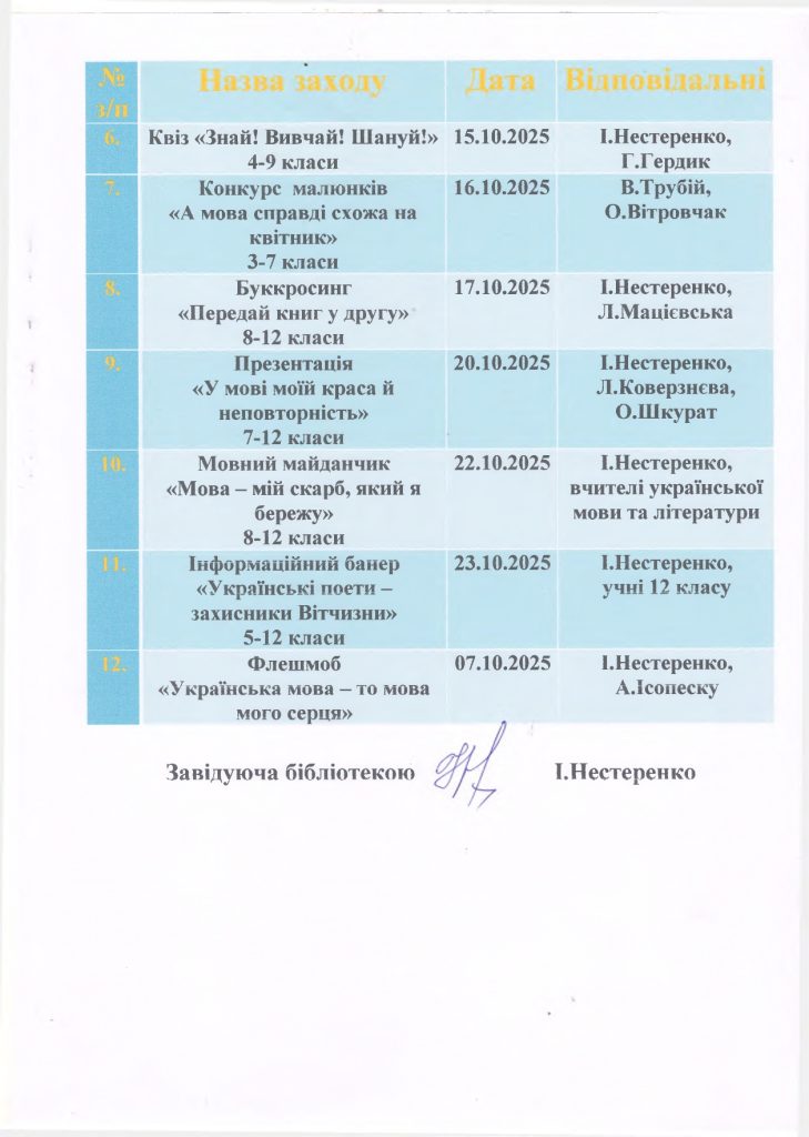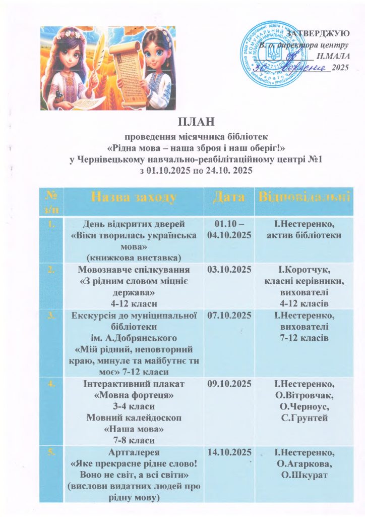 З 01.10.2025 по 24.10.2025 у нашому закладі стартує місячник бібліотек під гаслом «Рідна мова – наша зброя і наш оберіг», який об’єднує учасників освітнього процесу в утвердженні та розвитку української мови; популяризації української мови, як мови свободи та волі, а також могутньої зброї українського народу в боротьбі за незалежність і перемогу.