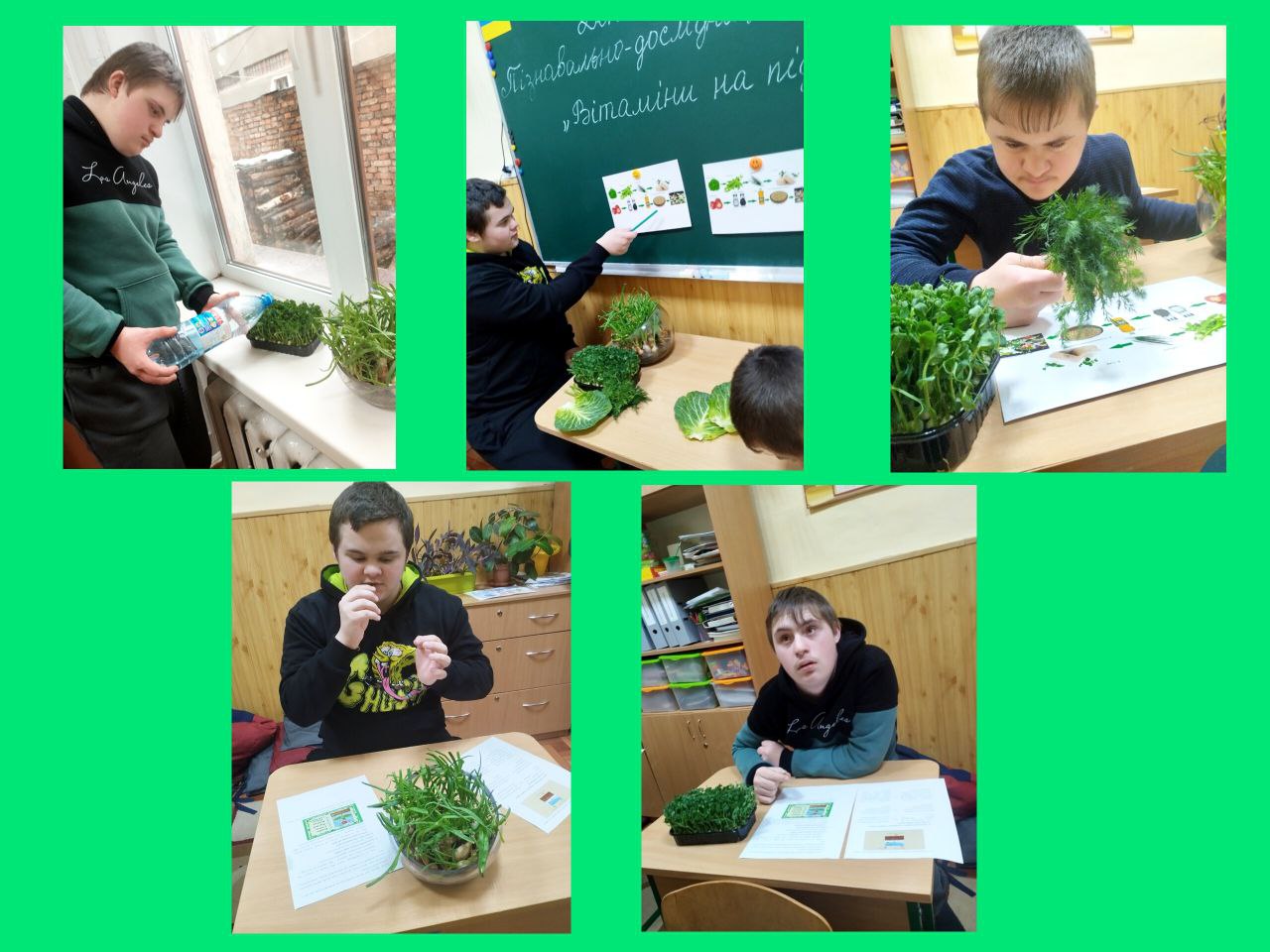 Скільки існує в природі корисних і смачних плодів, трав зеленого кольору! Сьогодні вихованці центру поринули в різноманіття смаків і ароматів: вчилися розрізняти зелені прянощі, збагатили скарбничку рецептів салатів, готували вишукані бутерброди, доглядали грядки на підвіконні і навіть посіяли руколу! Пізнаємо світ природи! Готуємося до нових відкриттів!