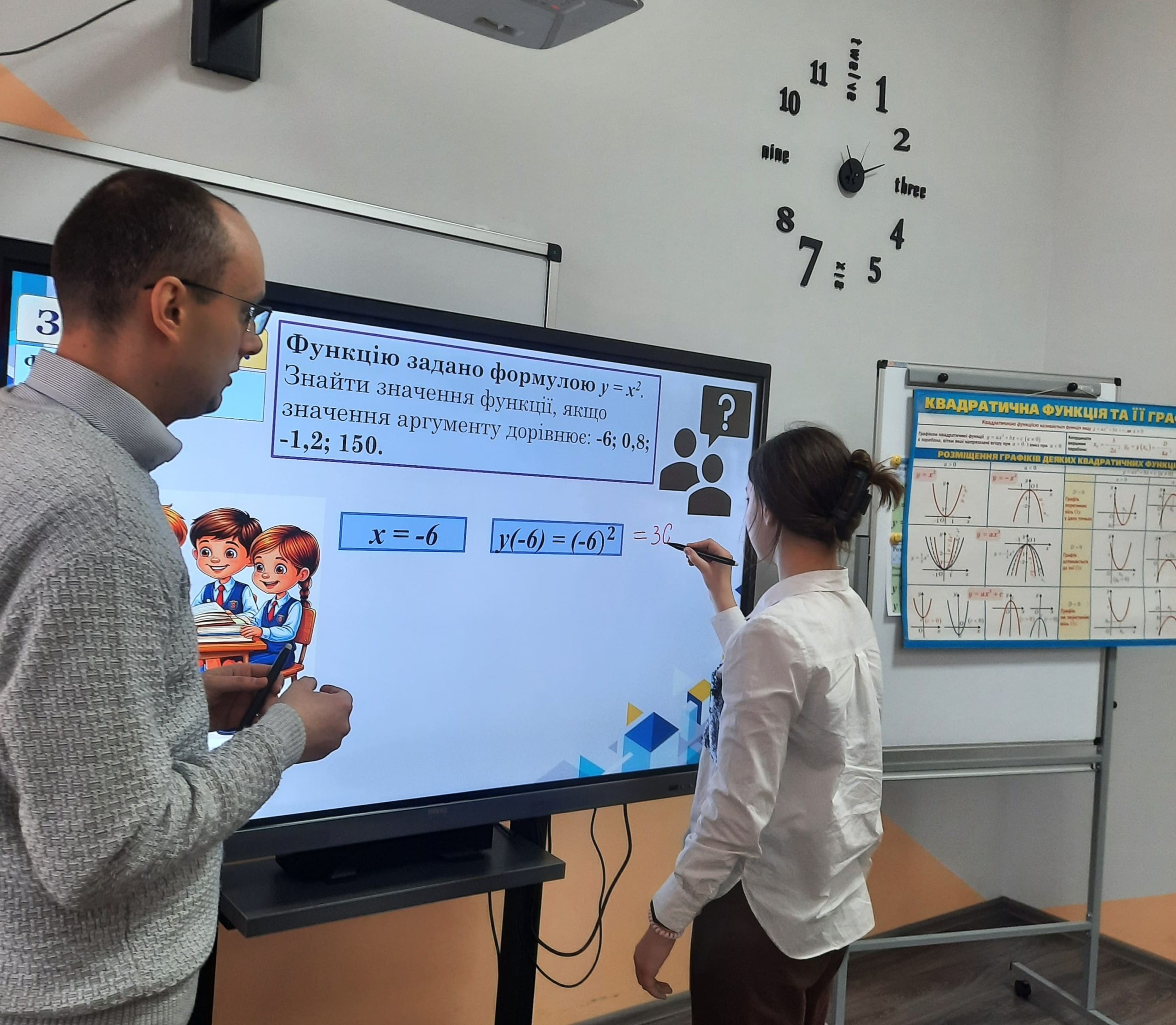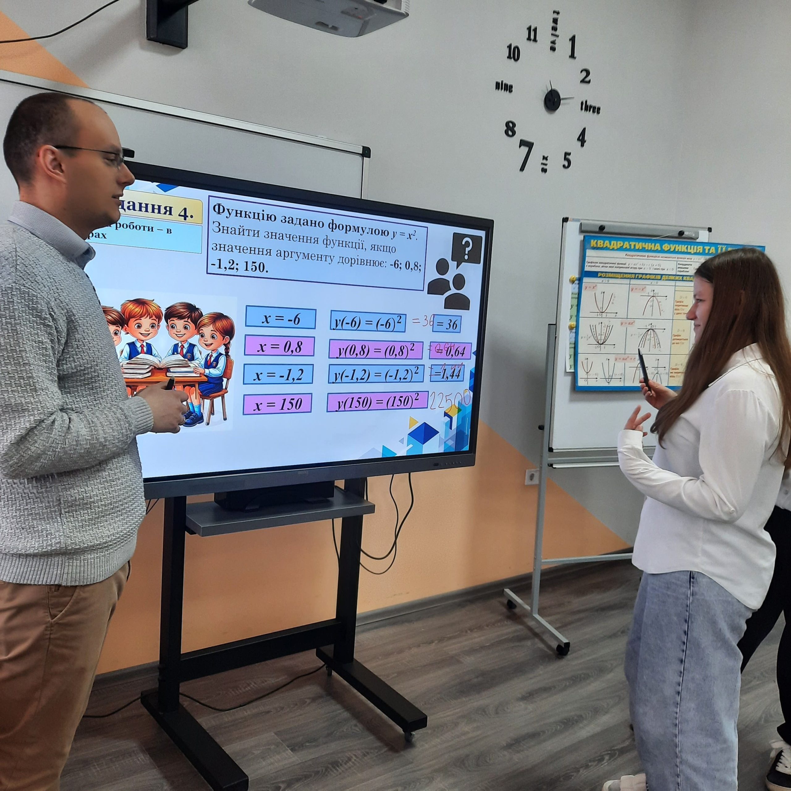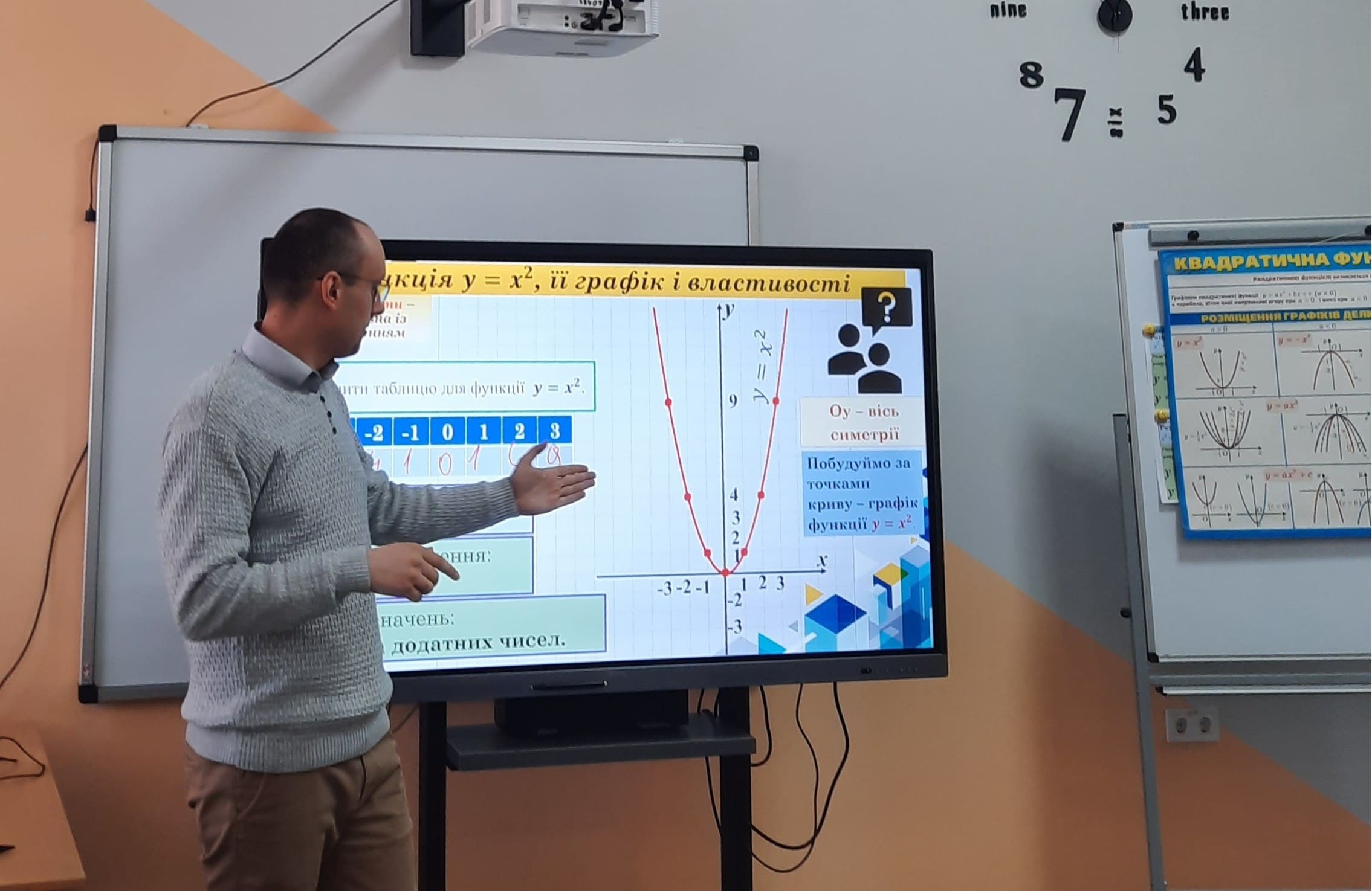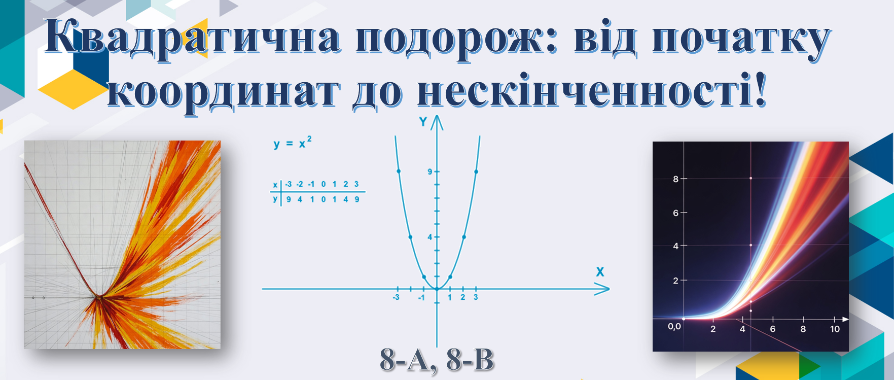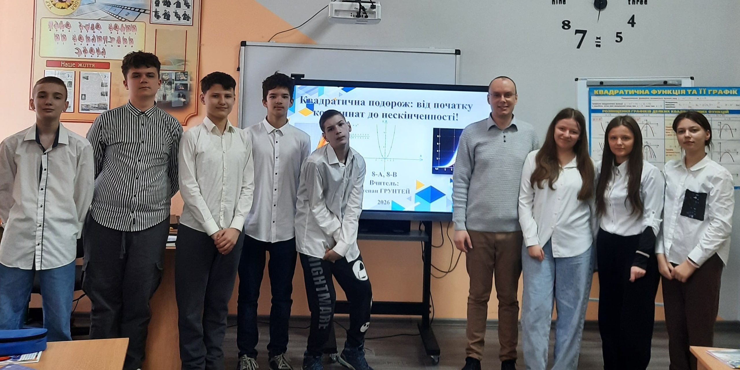 У 8-А та 8-В класах учитель математики й інформатики Степан Грунтей провів відкритий урок алгебри на тему: «Квадратична подорож: від початку координат до нескінченності!» Урок проходив у форматі захоплюючої подорожі-пригоди, де учні вирушили від точки (0;0) до нескінченності, досліджуючи функцію y = x², її графік (параболу) та основні властивості.