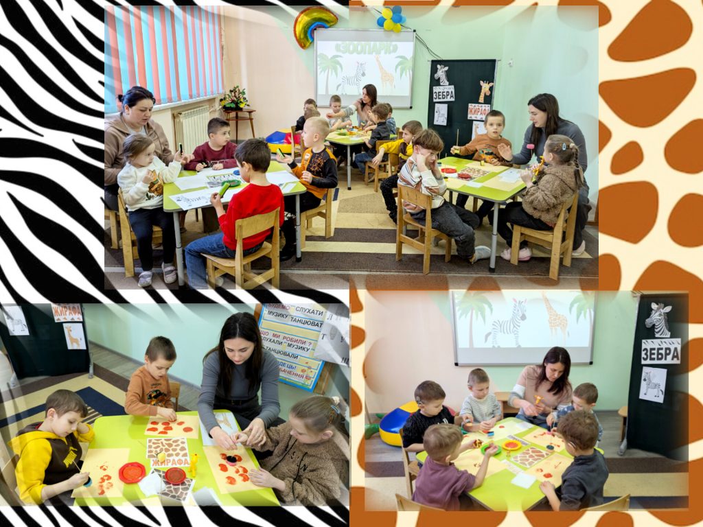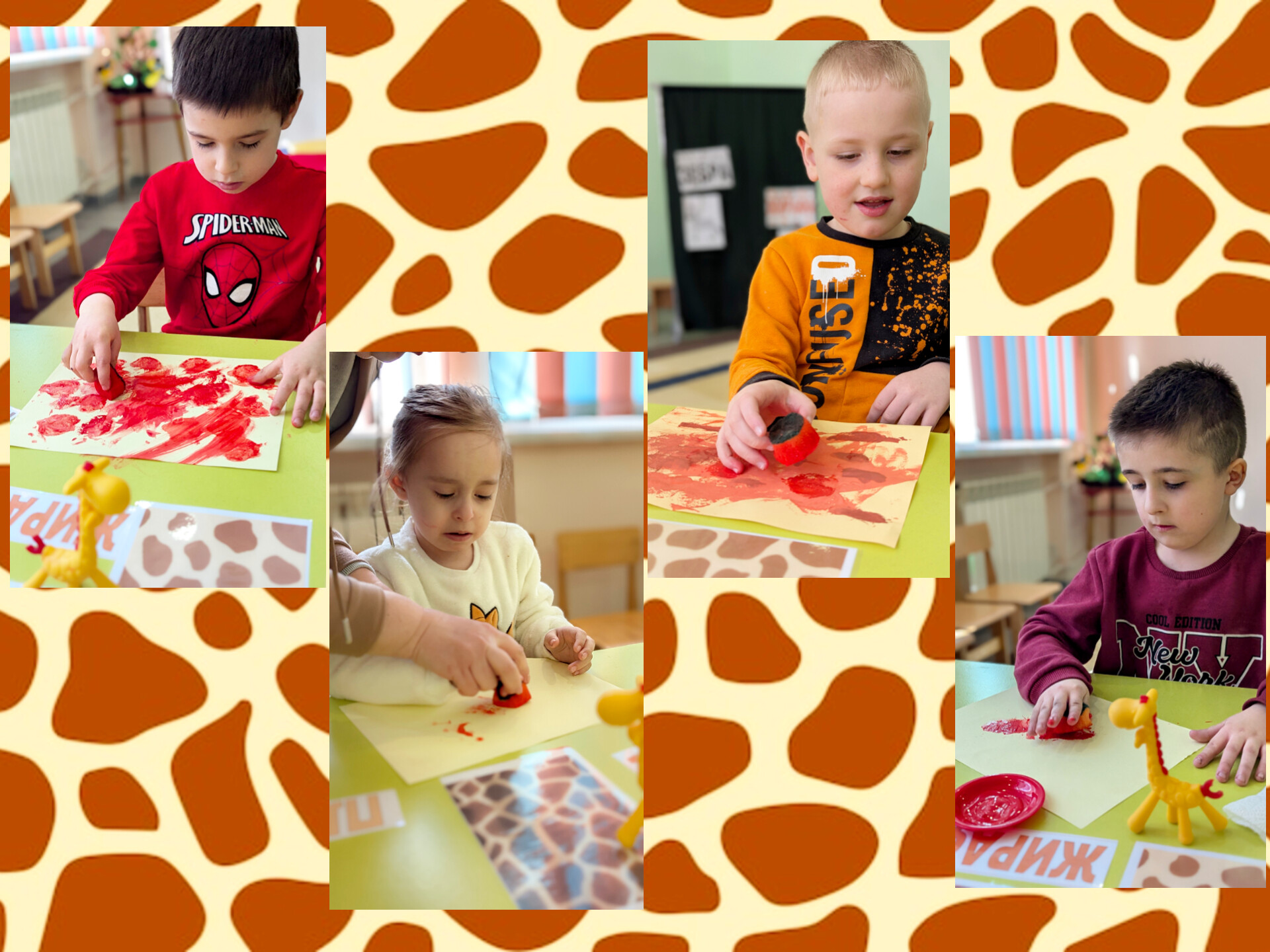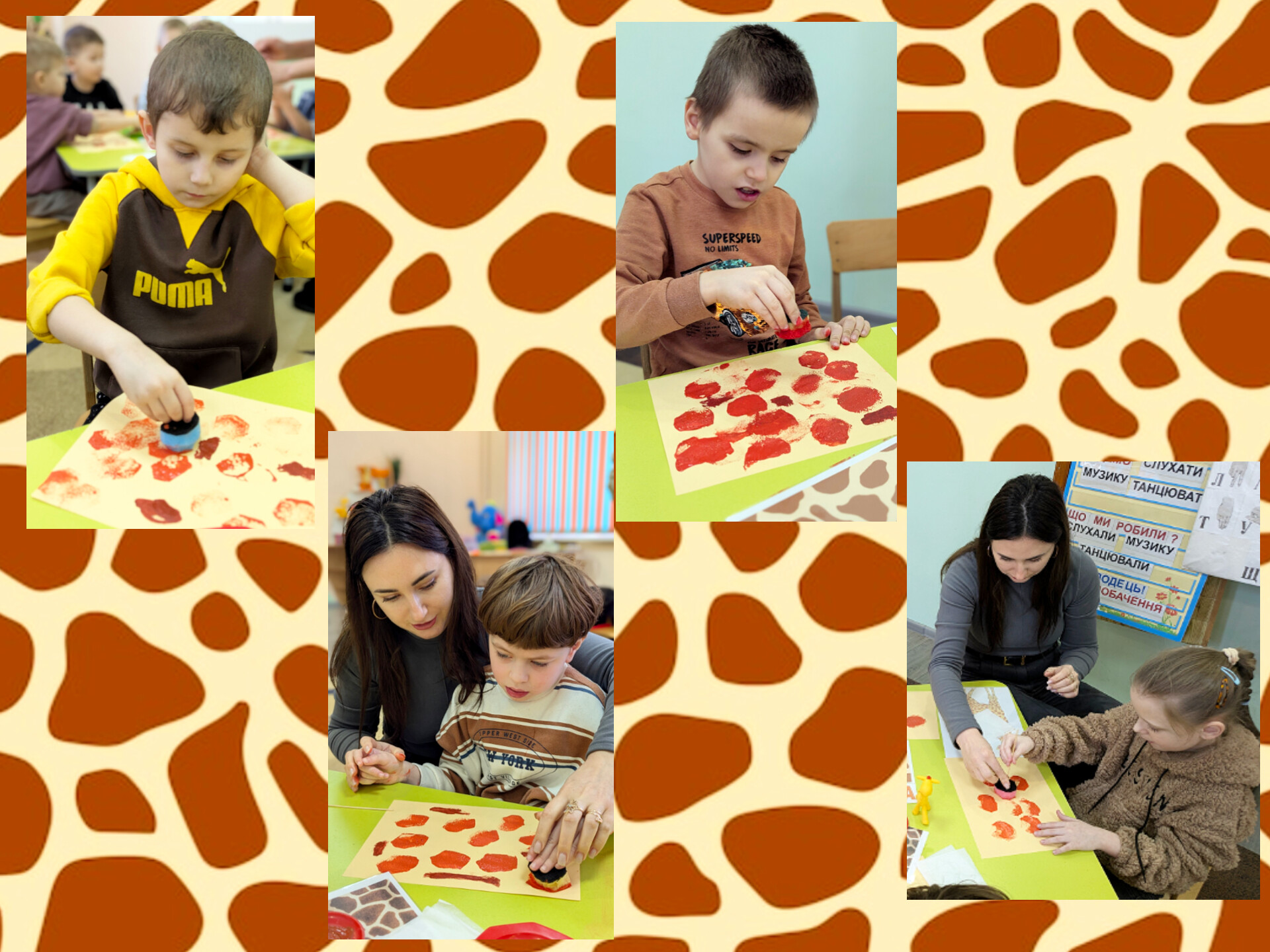 Сьогодні на дошкільному відділенні нашого центру відбувся творчий день, під час якого діти спільно виготовили жирафу та зебру в цікавій художній техніці. Малята досліджували принти тварин — смужки зебри та плями жирафи, уважно їх розглядали й намагалися відтворити у власних роботах. У процесі діяльності діти разом обговорювали забарвлення тварин, повторили їхні назви та назви частин тіла. За допомогою різних технік малювання вихованці створювали плями й смужки, а також працювали в команді, з’єднуючи свої роботи у велику спільну композицію. На завершення заняття діти виконали танцювальні вправи разом зі створеними тваринами, отримавши багато радості та позитивних емоцій.
