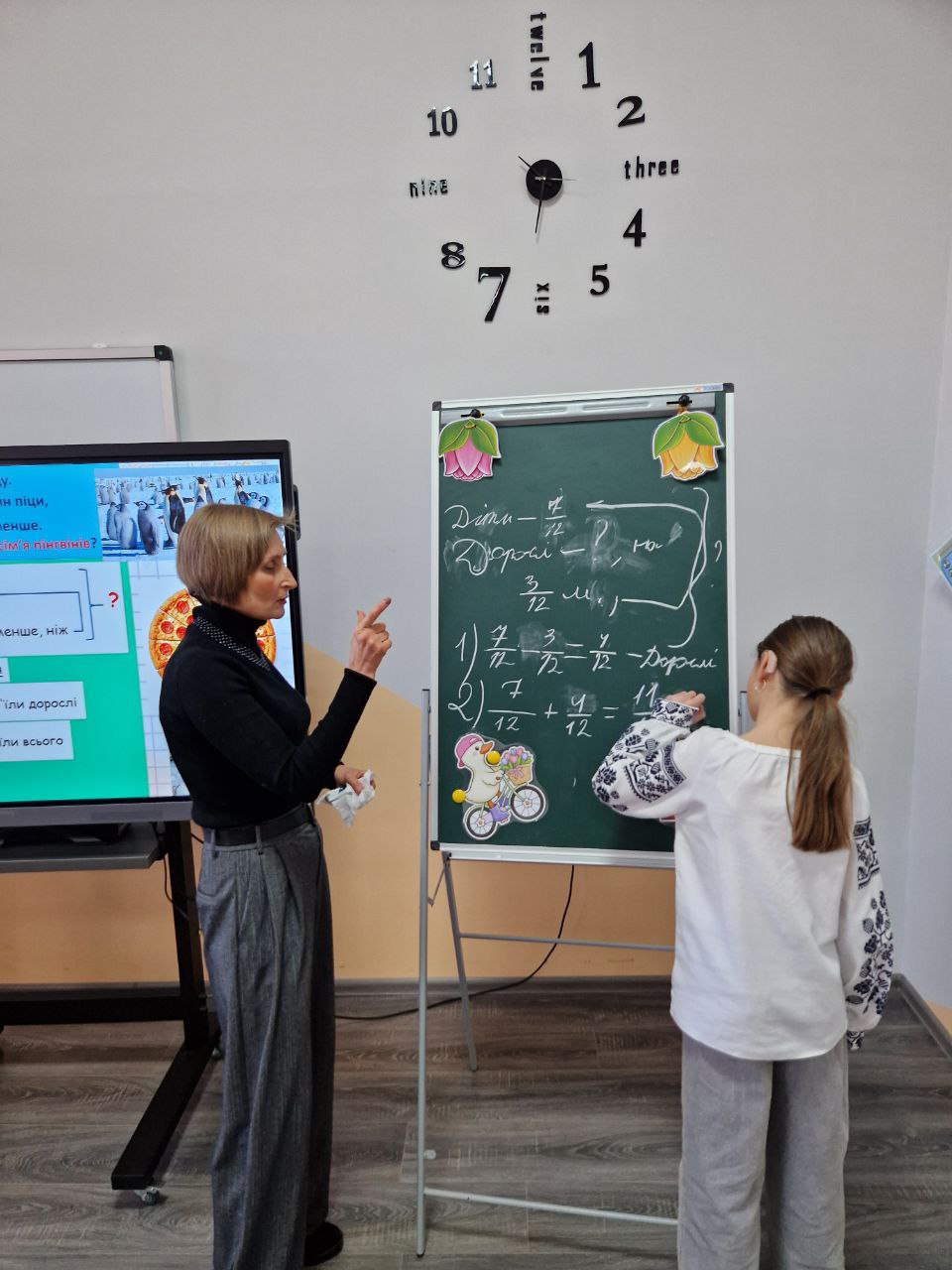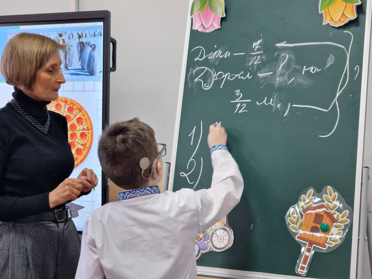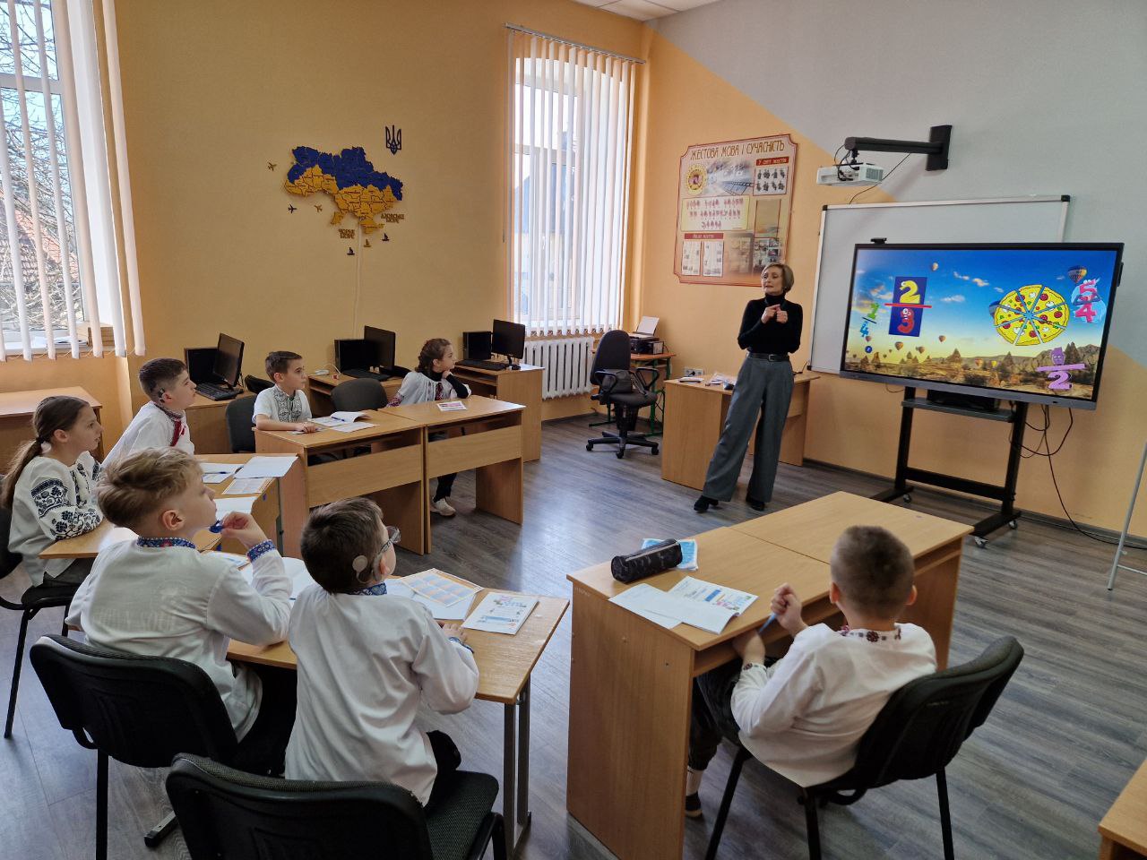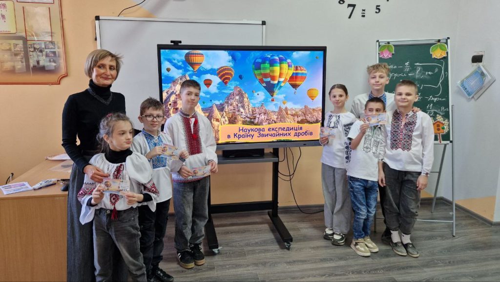 Учні 5-А класу на уроці математики ( вчителька Олеся Присяжнюк) мандрували Країною Звичайних Дробів. Така собі справжнісінька наукова експедиція на повітряній кулі. П’ятикласники познайомились з вороням, яке планує свій день за законами математики, навчили хамелеонів розрізняти правильні і неправильні дроби, провели тест-драйв у джунглях з мішаними числами та пінгвінячі перегони по додаванню і відніманню дробів в Антарктиді.