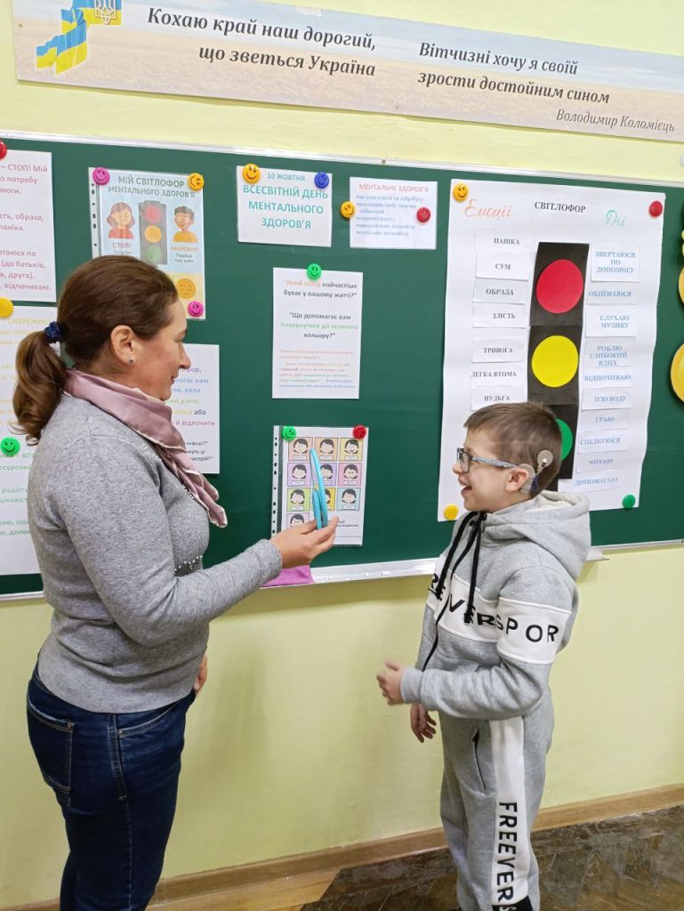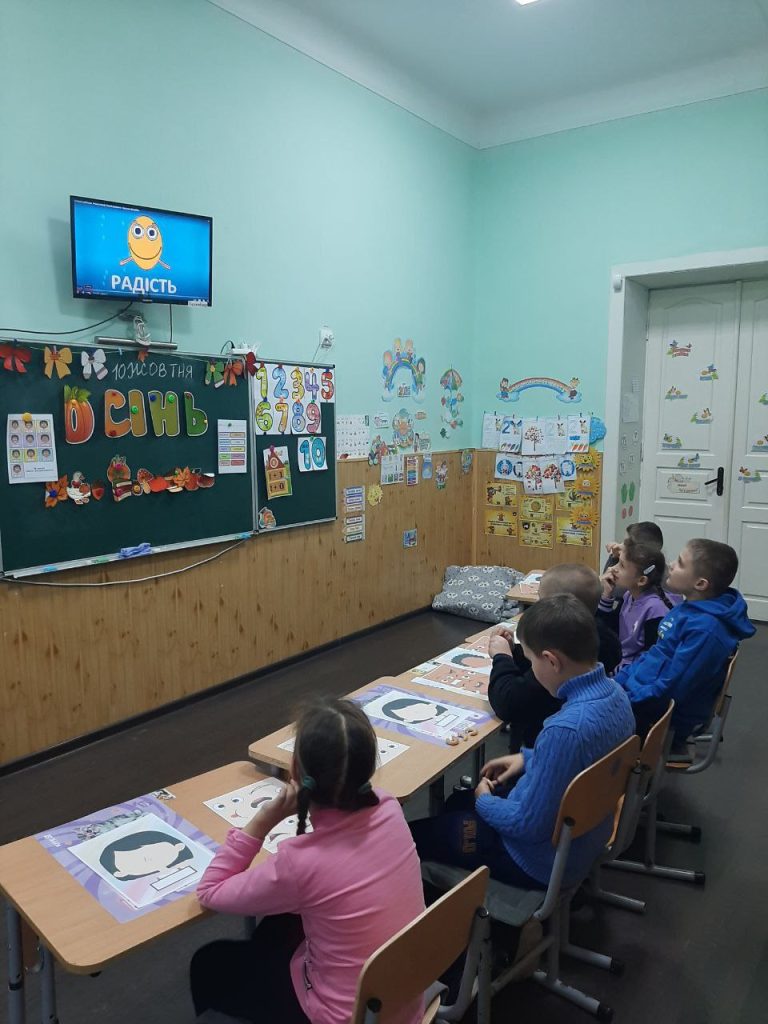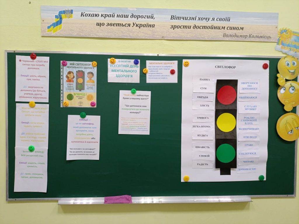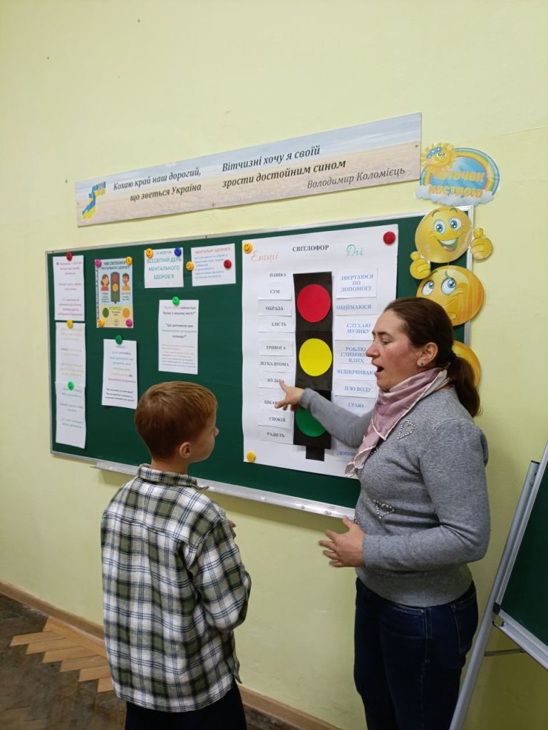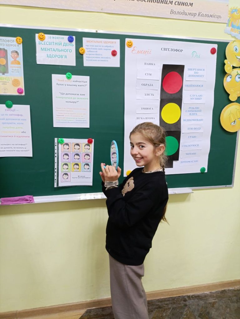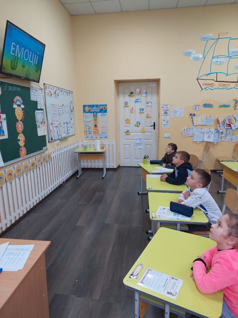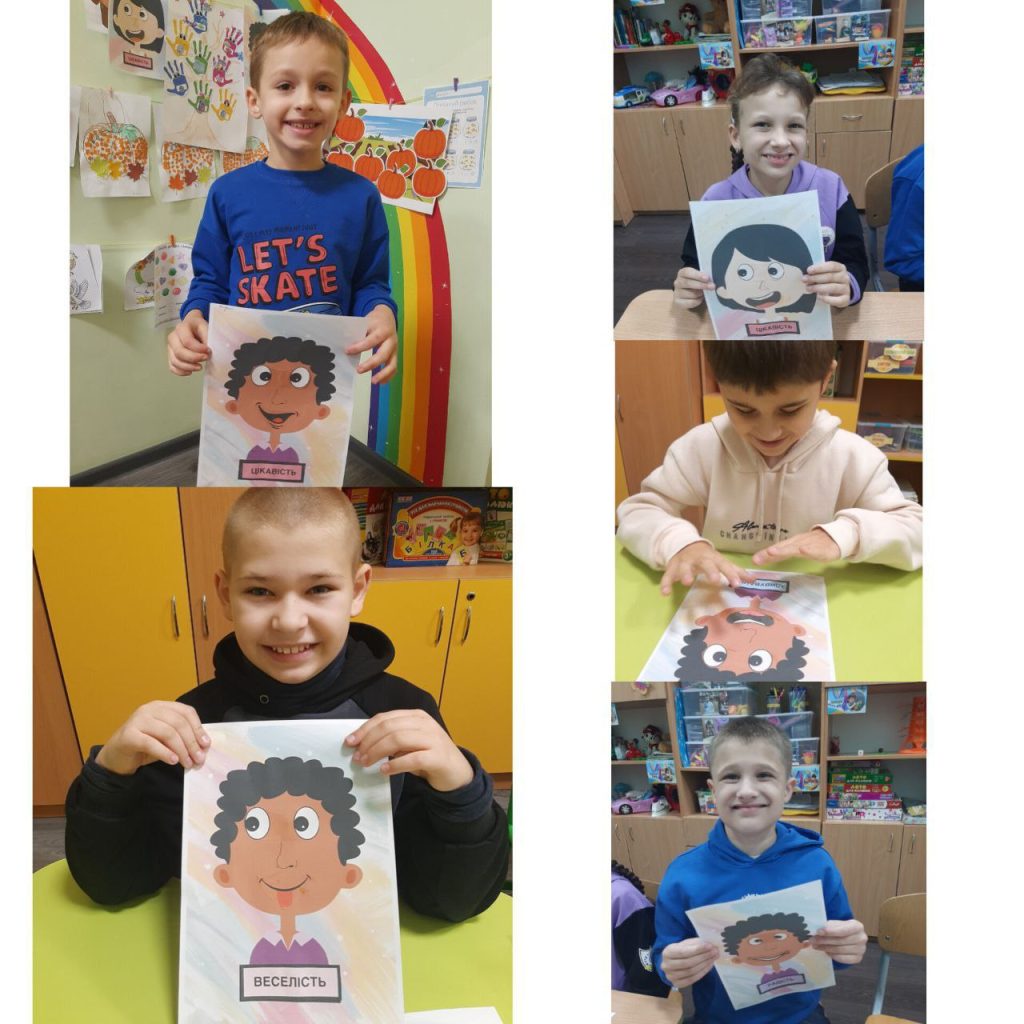Діти брали участь у конструктивній грі “Мій світлофор ментального здоров’я”, виконували вправи “Сила усмішки”, “Обійманці”, “Картки сили” від Світлани Ройз, техніку “Дзеркало 10 емоцій”, створили аплікацію “Світ емоцій”, переглядали відеоролик “Емоції з рибками”.